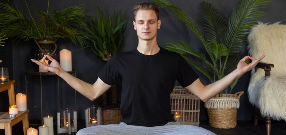 Сядьте удобно в позу лотоса с закрытыми глазами и прямым позвоночником. Положите ладони вверх на колени.