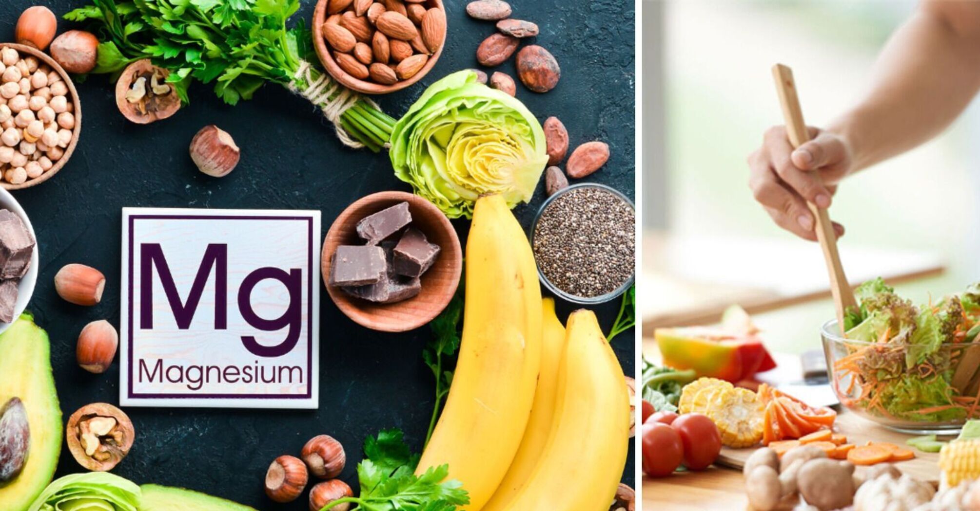 Велика кількість магнію міститься в овочах з листям темно-зеленого кольору, оскільки магній – важливий компонент хлорофілу, зеленого пігменту рослин. Також багато його в морських водоростях, наприклад, в морській капусті, морепродуктах. Є він і в бобових, рибі, м’ясі, горіхах, сухофруктах, овочах і фруктах. До речі, багато магнію містить м’ясо равликів…